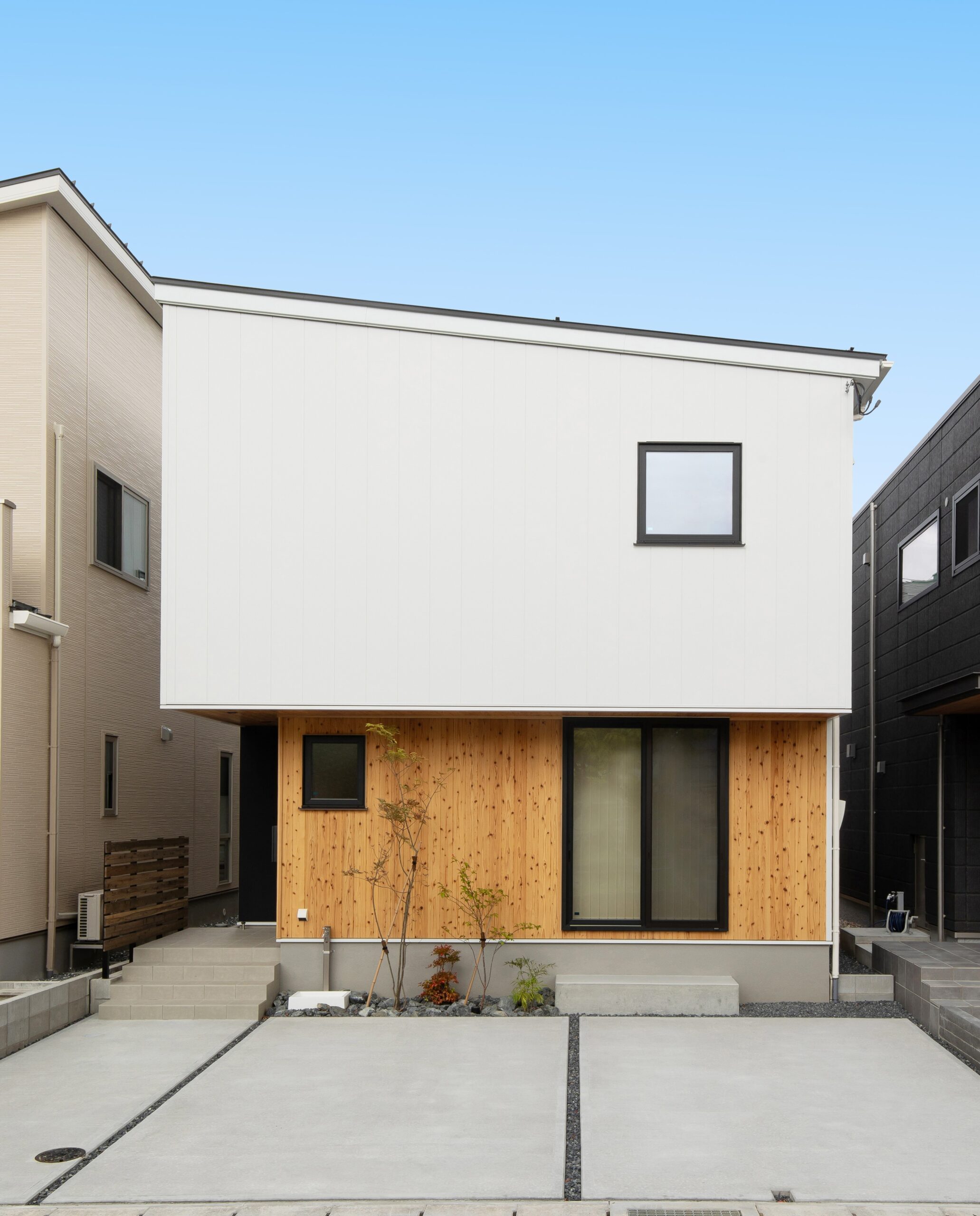 外観は白のガルバリウム鋼板をベースにアクセントは、