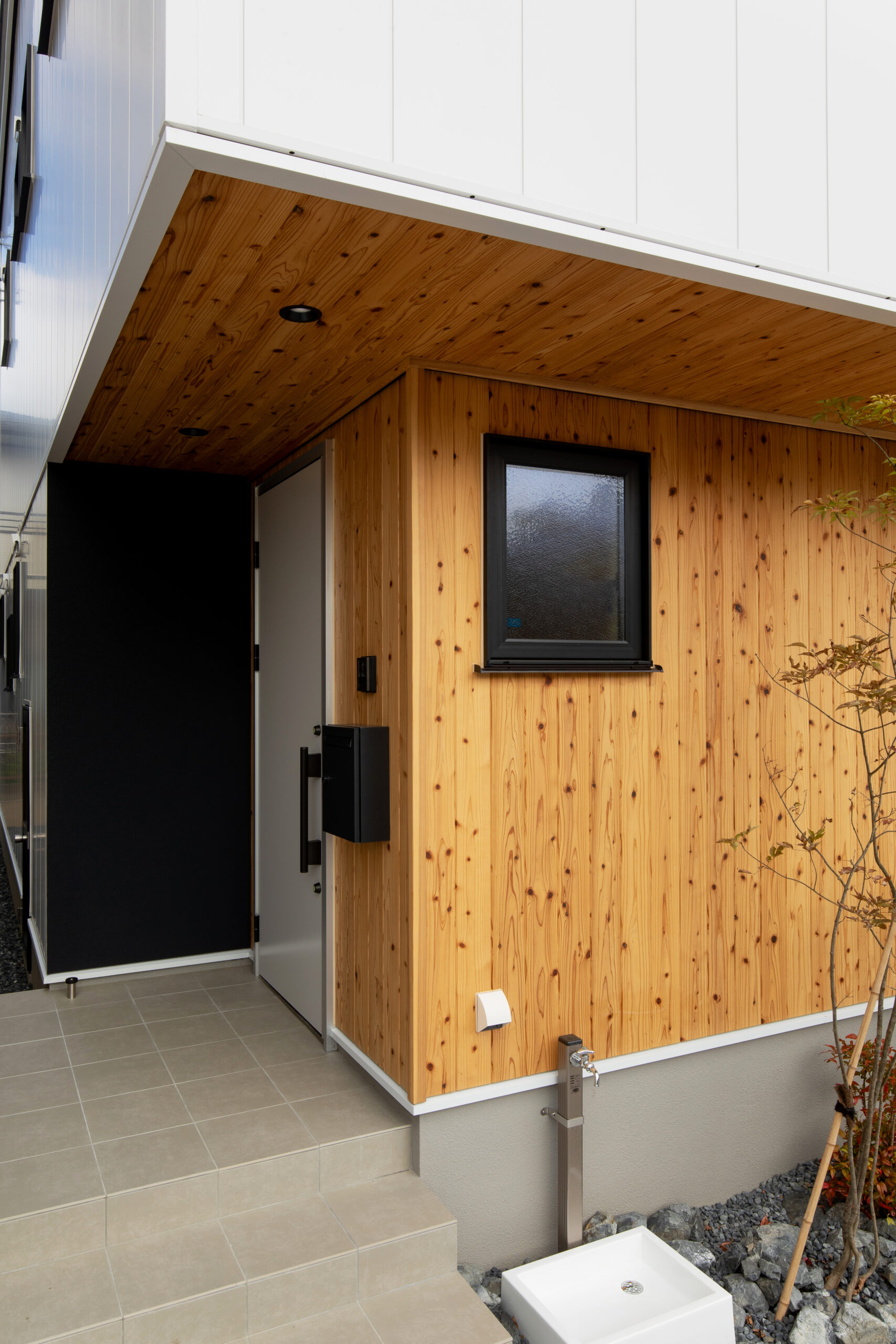 飫肥杉の無垢板とジョリパットの吹き付け塗装を採用しました。
