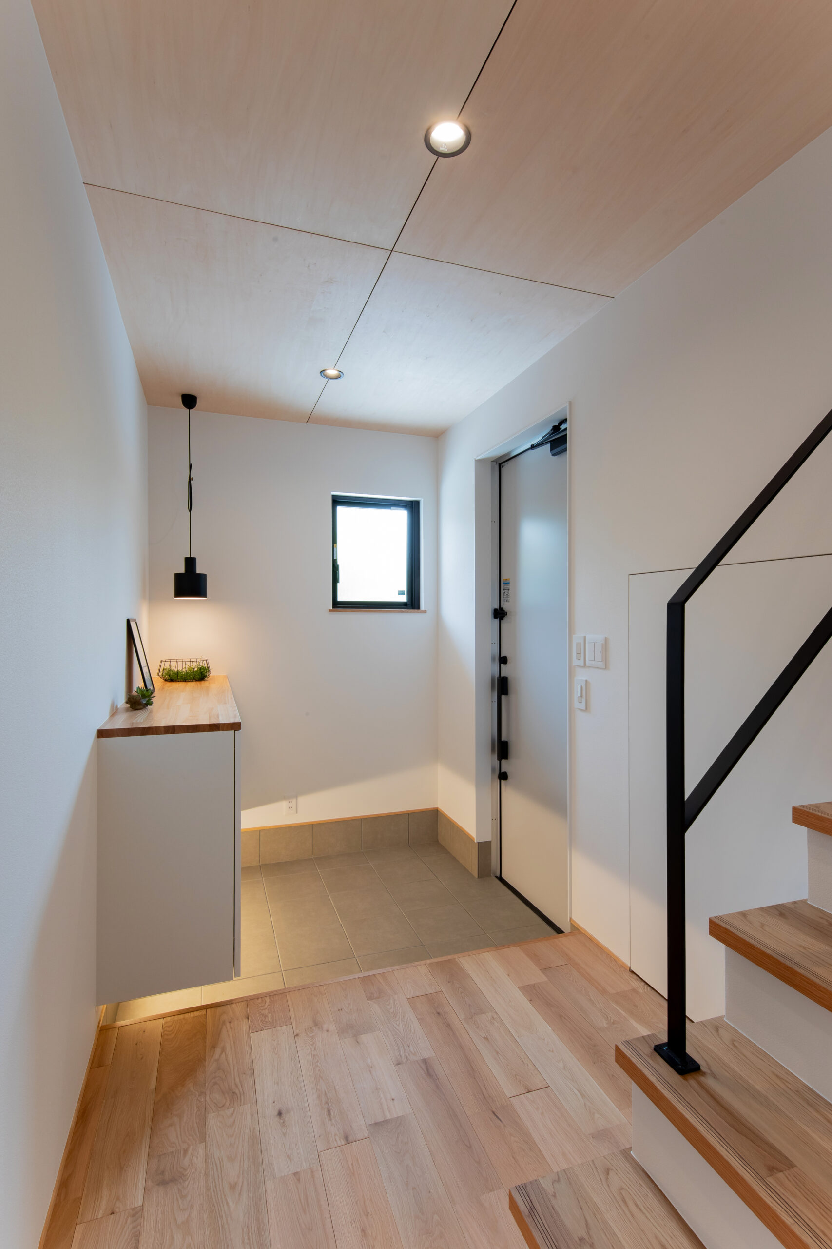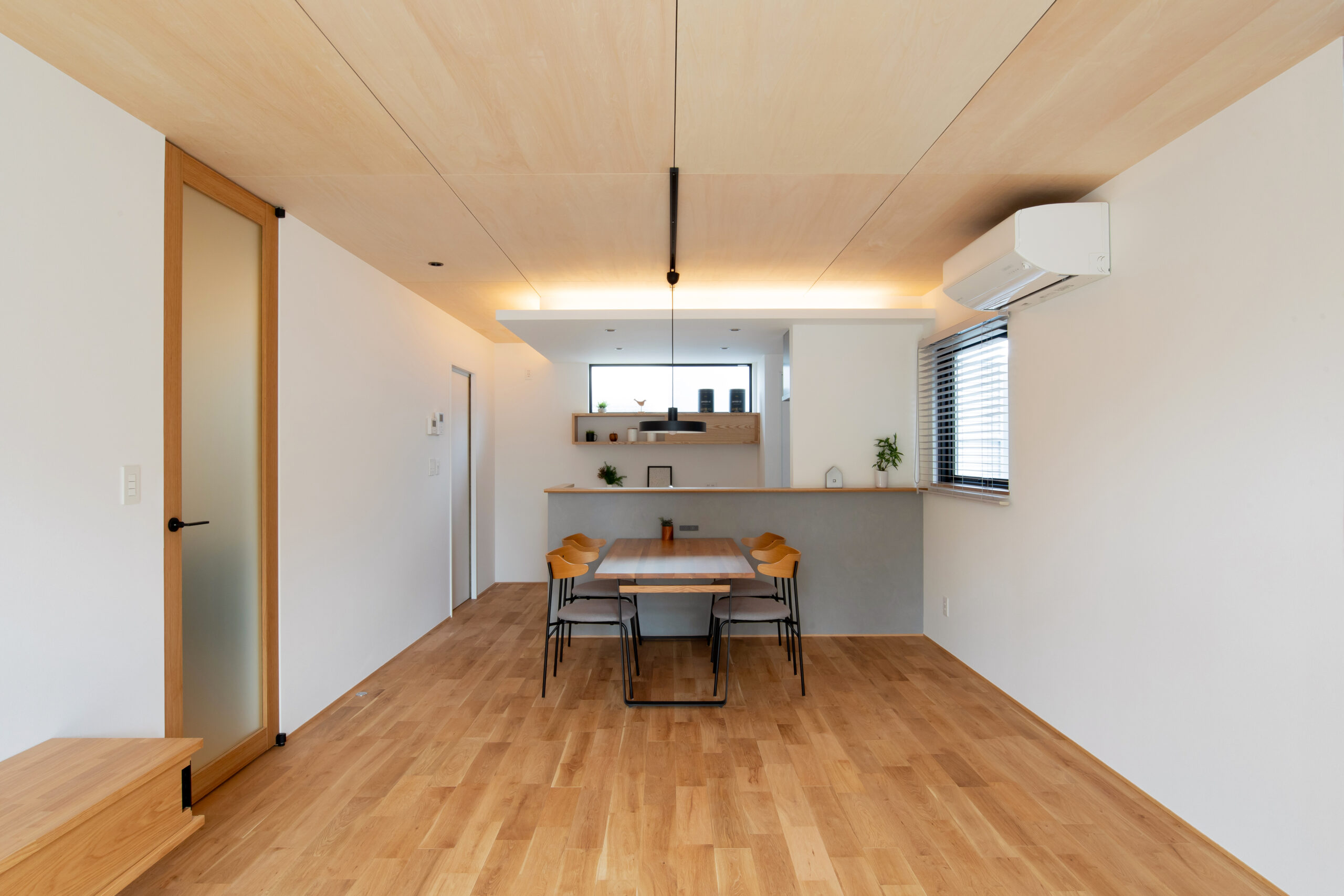 天井には無塗装のシナベニヤを貼り、キッチンの腰壁にはグレイッシュ系のエフェクト塗装を施しました。